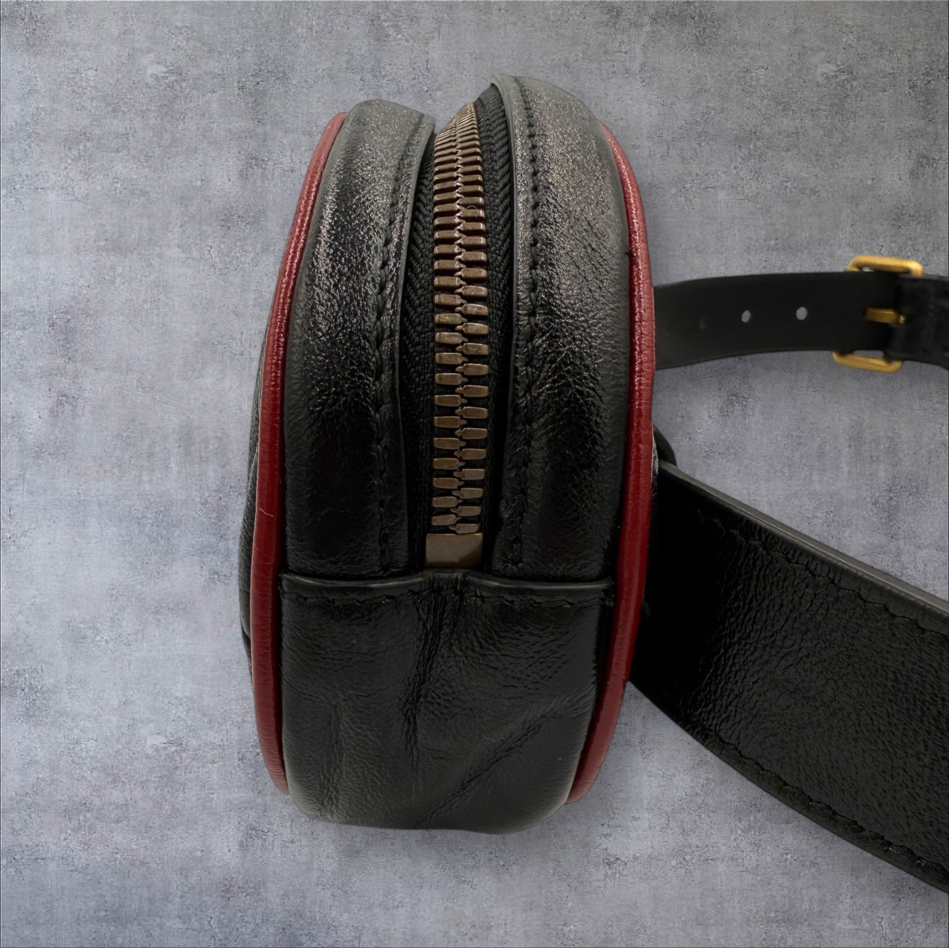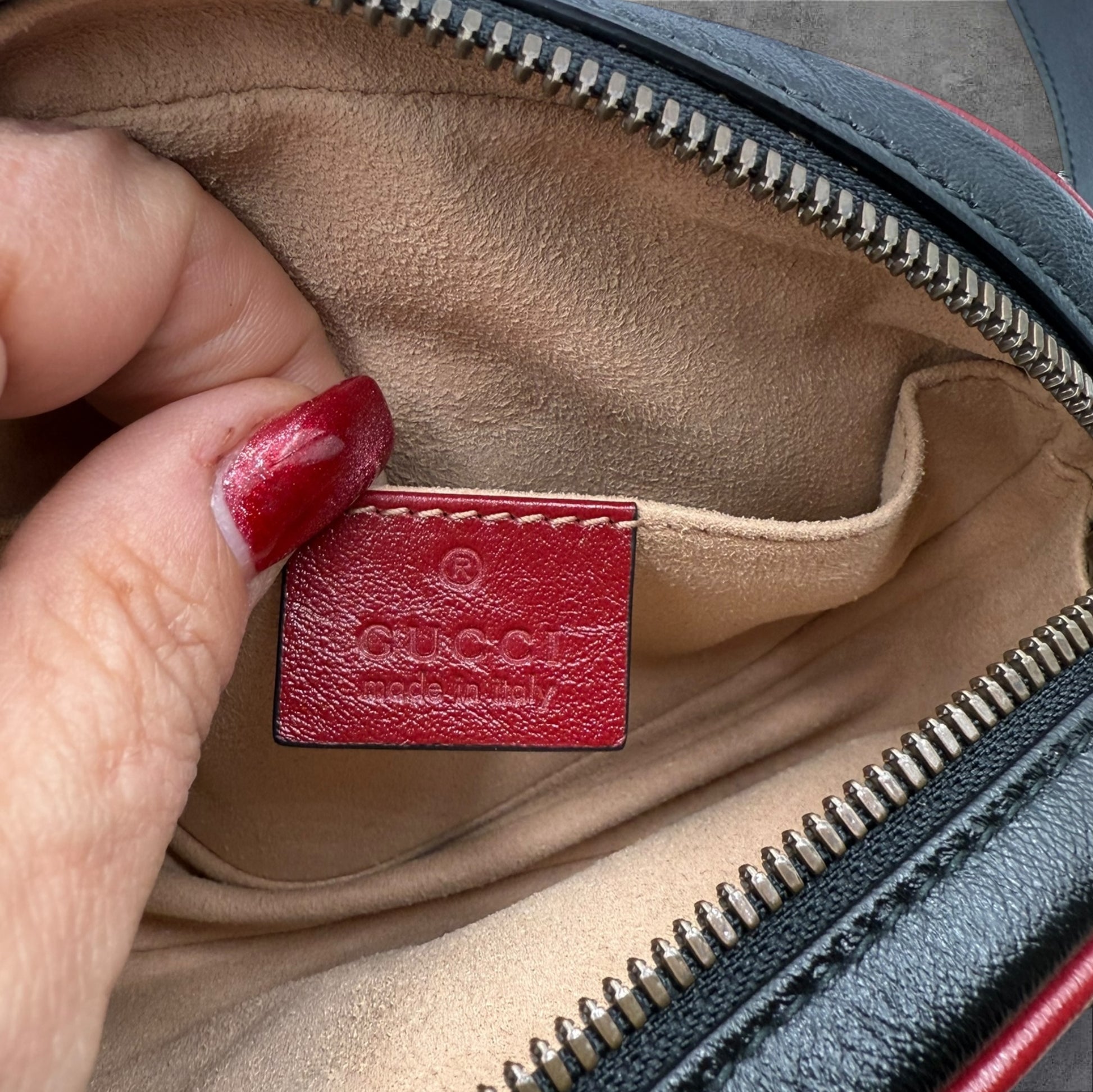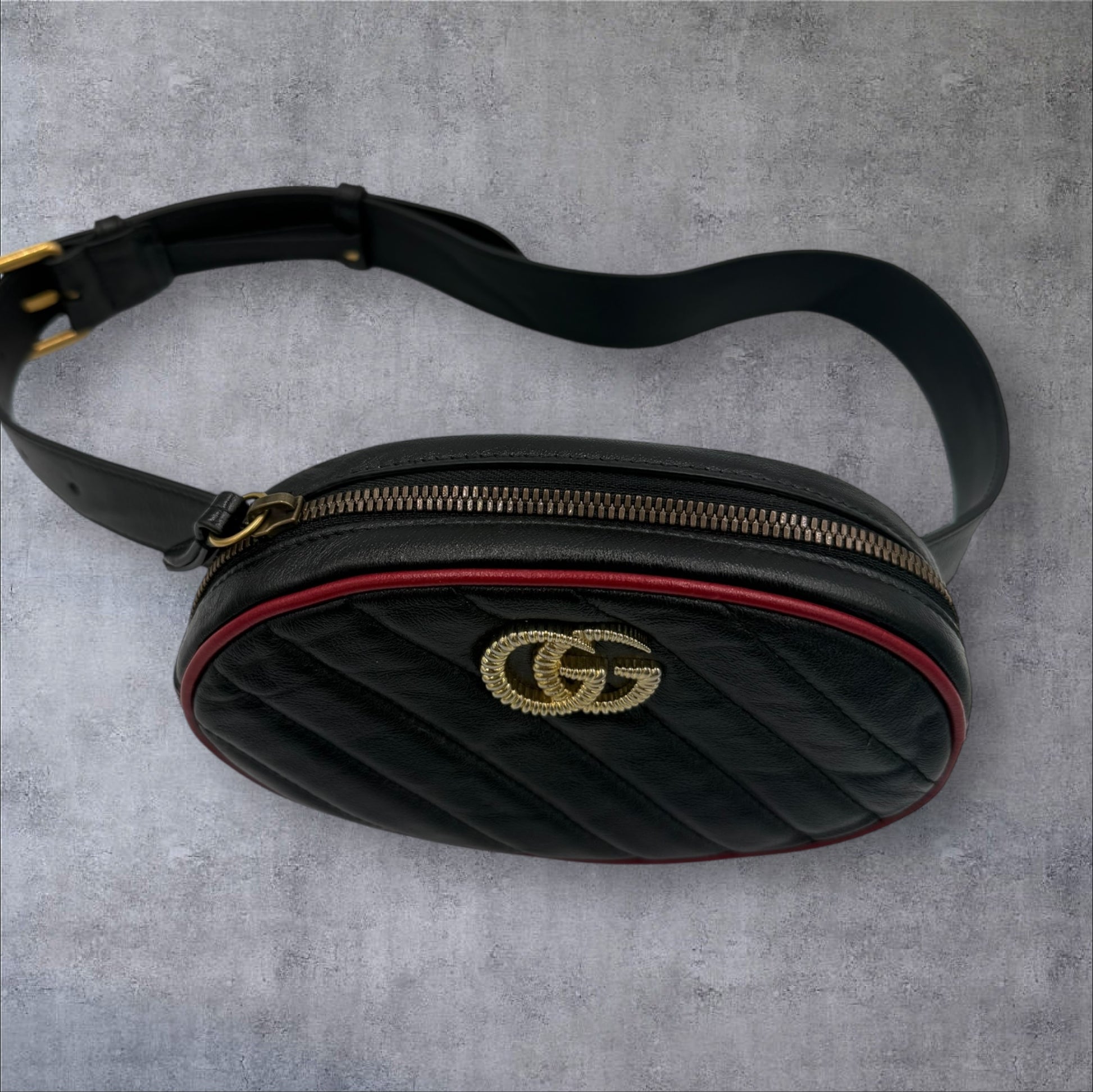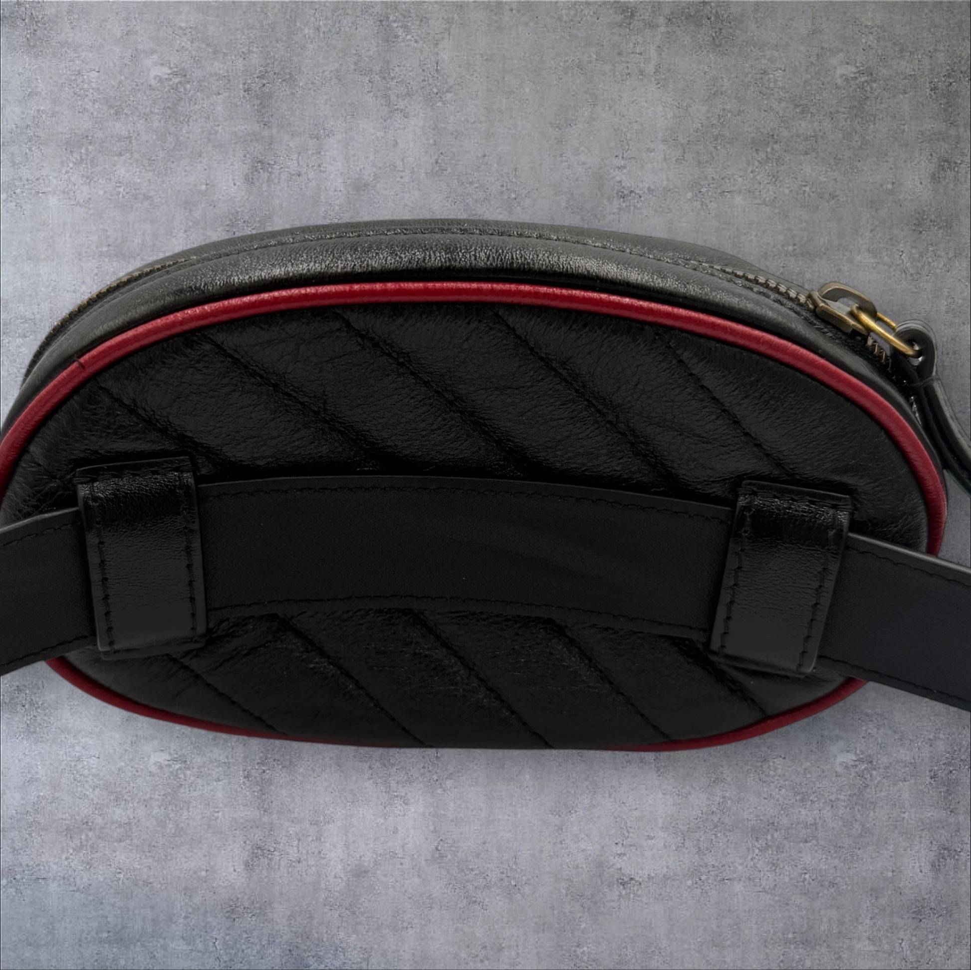 340. Gucci GG Black Calfskin Marmont Matelasse Leather Belt Bag with red trim