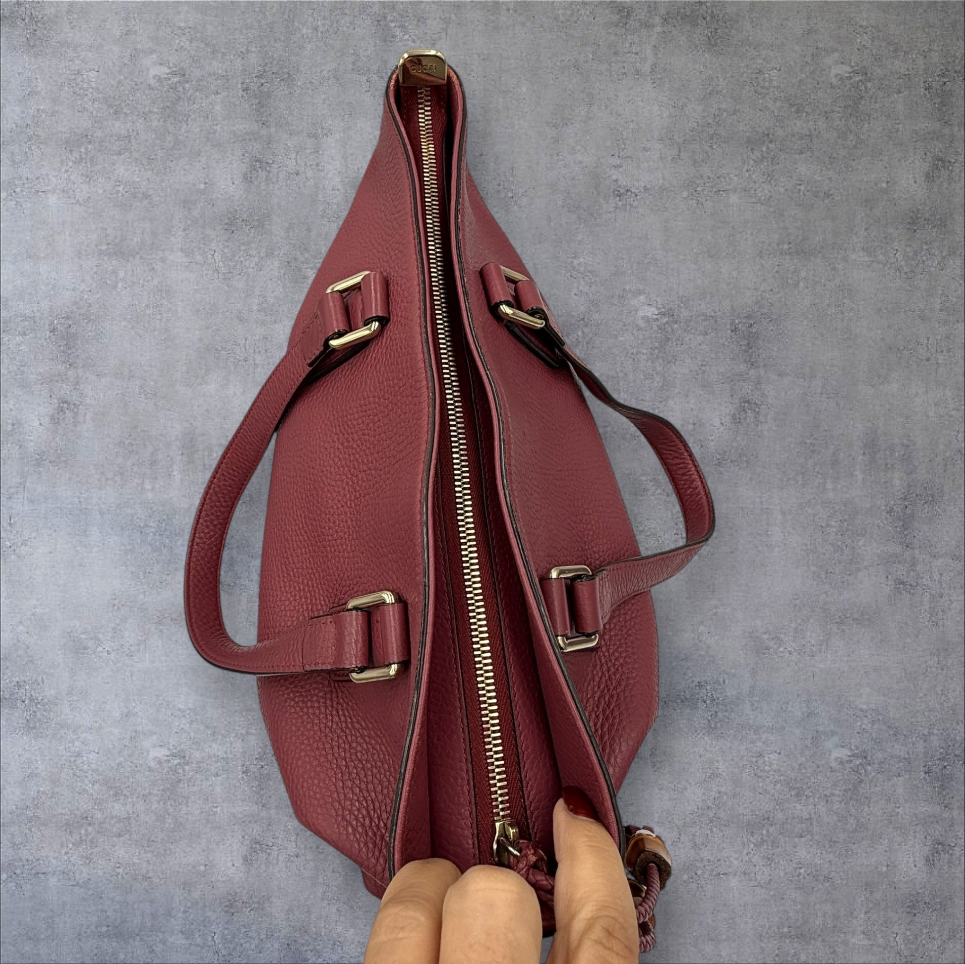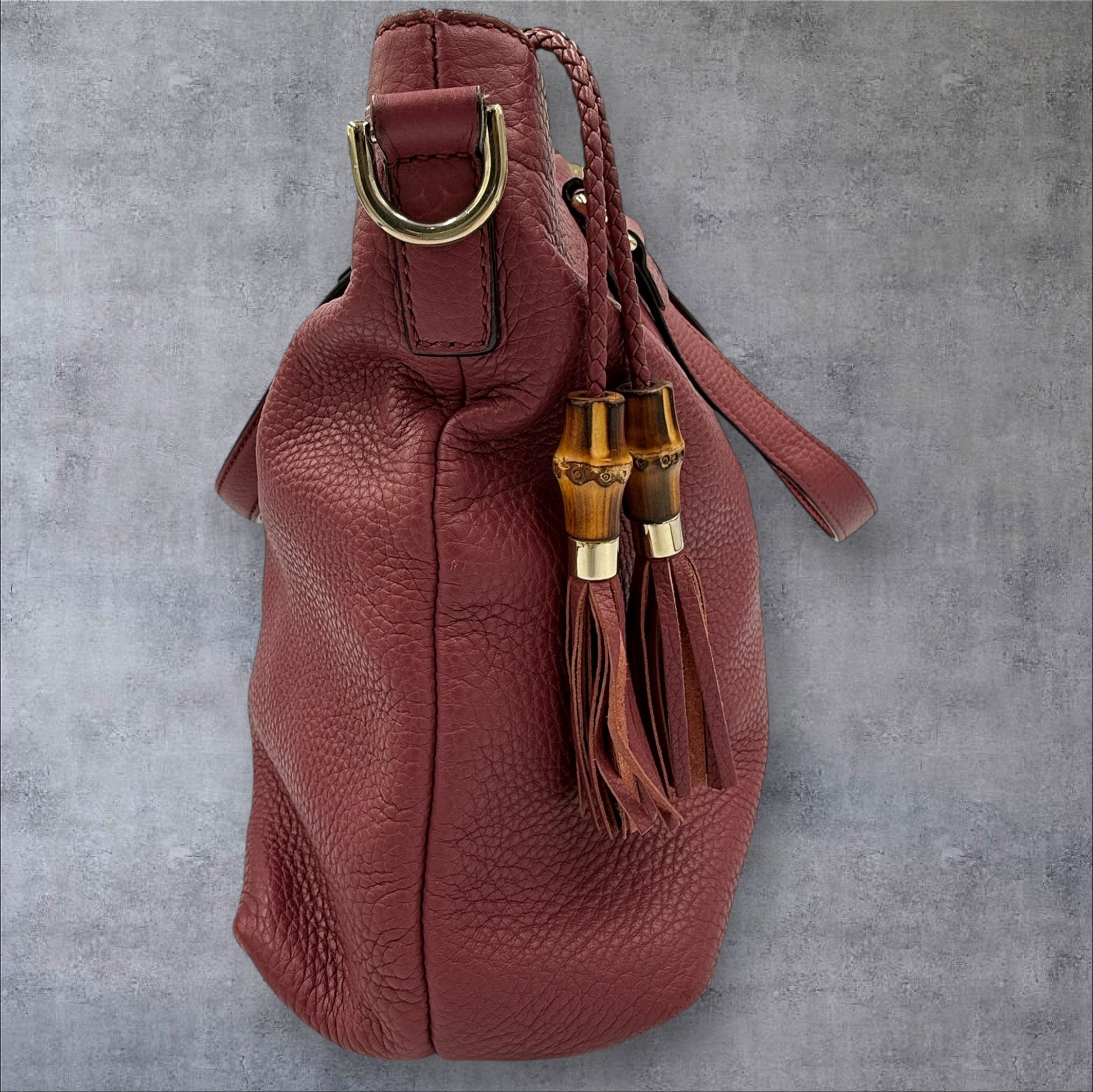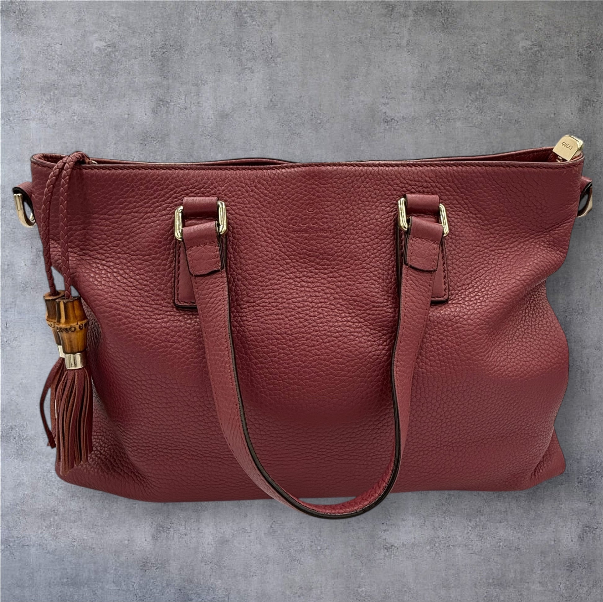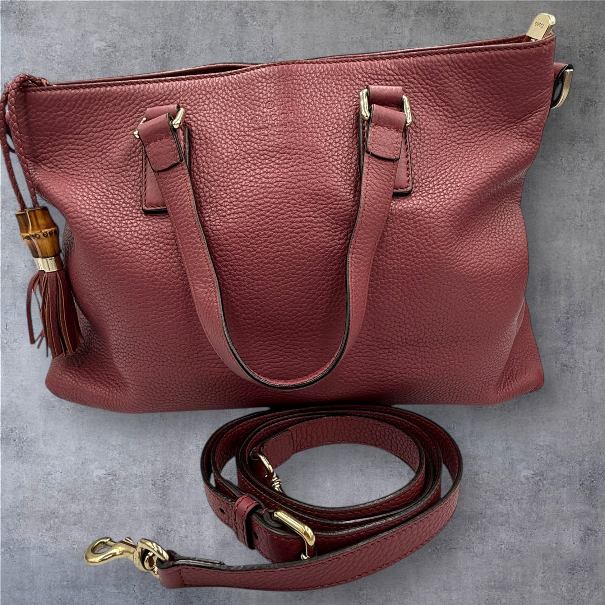 - This is the most beautiful color, pink/mauve Gucci bamboo tassel tote